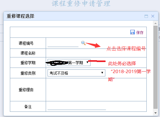 在上述规定时间登录http://yjsxt.cumt.edu.cn选课系统,打开登录界面。填写用户名(本人学号)、密码、选择身份(请选择“学生”),点击“登录”按钮进入;依次点击“培养”——“课务管理”——“课程重修申请管理”,点击“申请”选择需要申请重修的课程,重修学期务必选择“2018-2019第一学期”。选择需要重修的课程编号、重修学期、重修类别,填写重修理由,之后点击“保存”,等待课程管理部门审核。(见图一、图二)