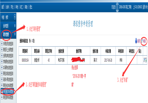 重修申请系统审核通过后,请在选课系统进行选课,选择需要重修的课程。点击“课务管理”——“课程网上选课管理”——培养计划内课程点击选择班级、培养计划外课程点击“方案外课”选修培养计划外的课程。