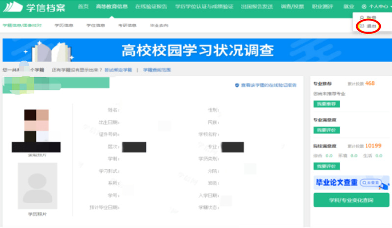 第三步:核对个人信息,重点核实内容:姓名、性别、民族、出生日期、证件号码、学号、录取专业、学制、入学日期等研究生学籍信息;学历等照片暂无,其他信息由学校统一格式填报。核对无误后点右上方“退出”,学籍自查工作结束。